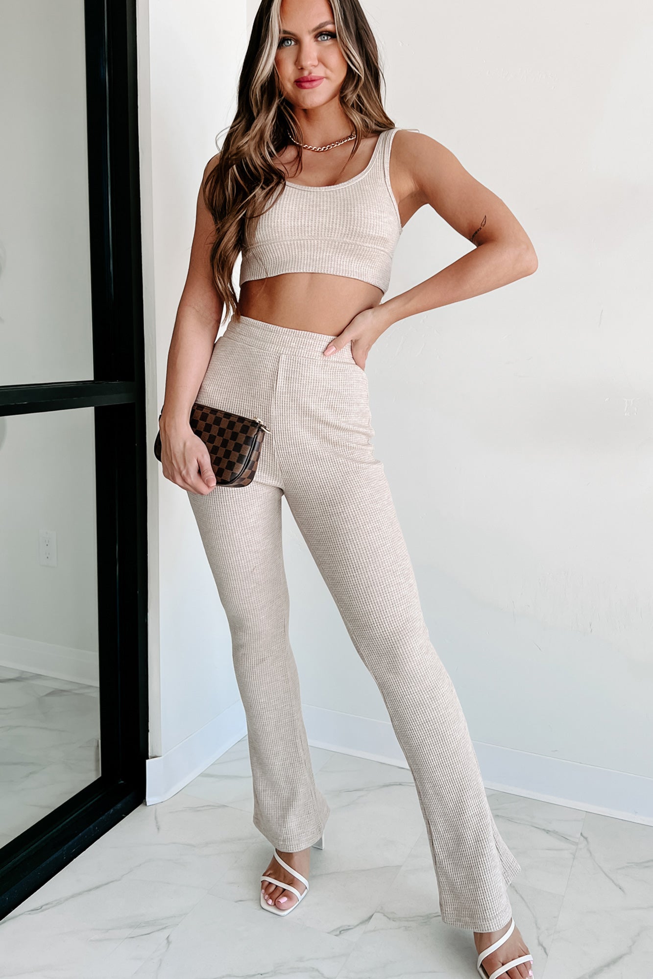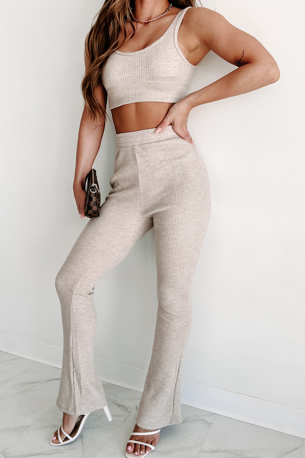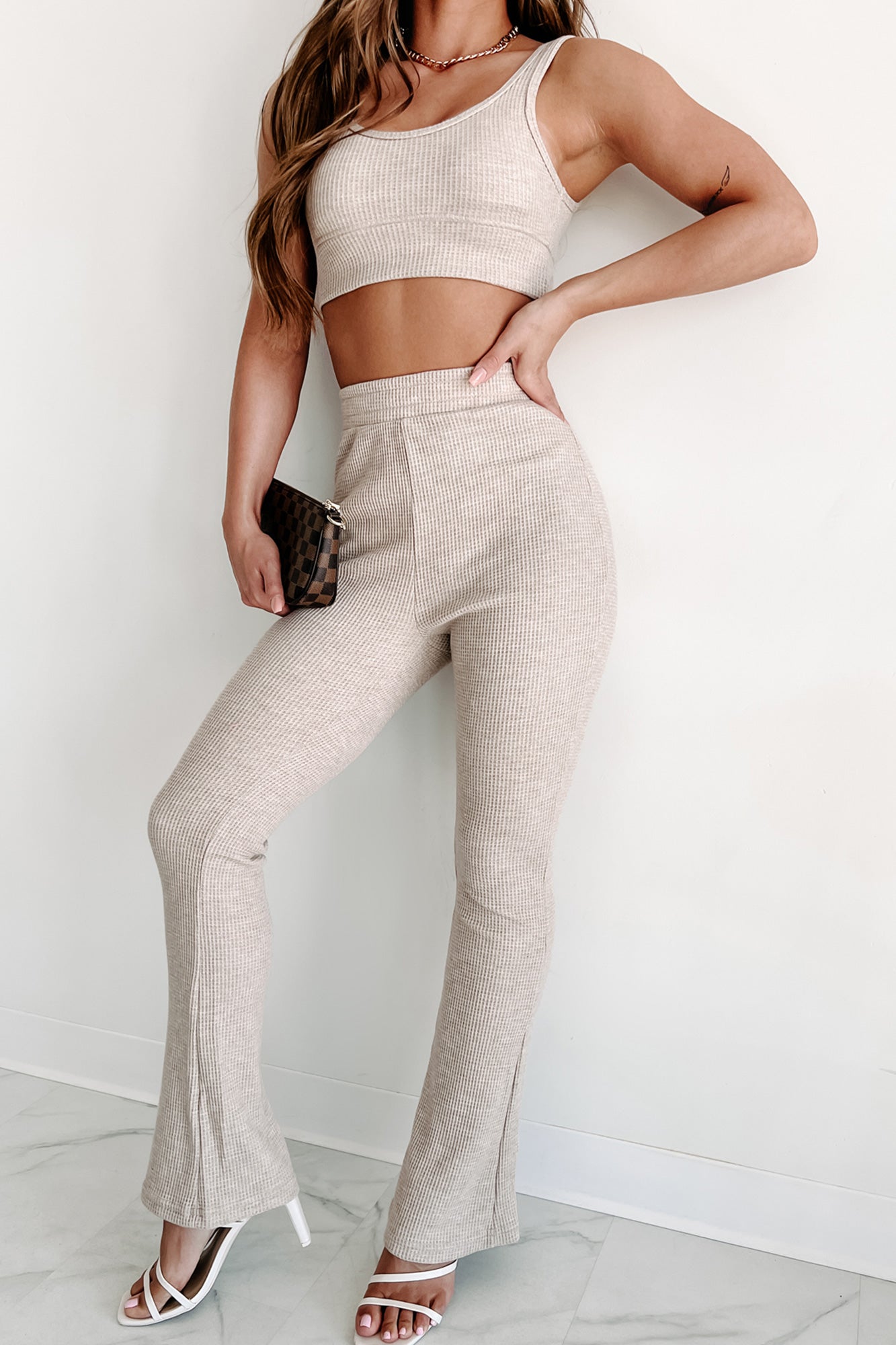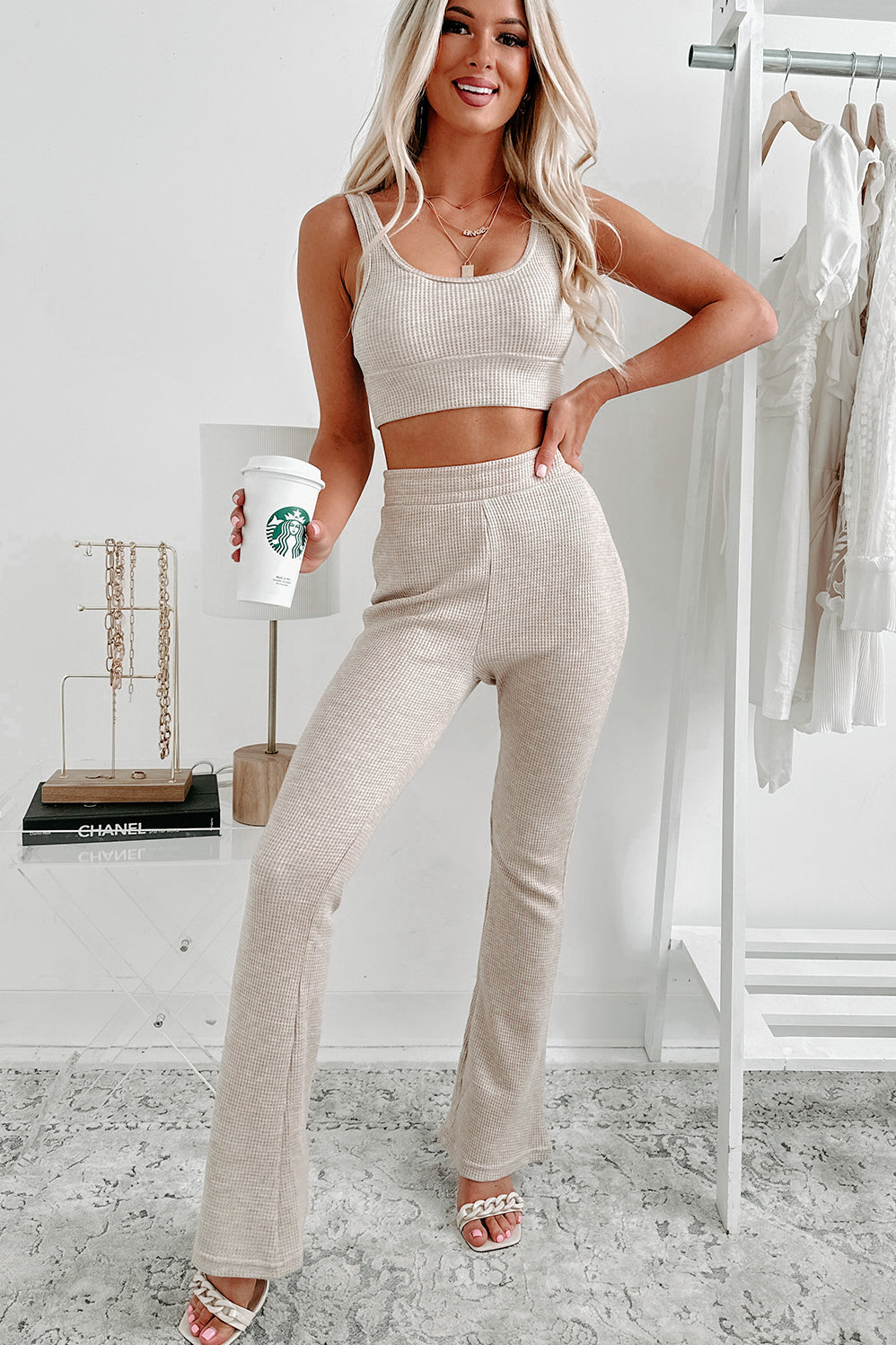 - Bottoms: High-Rise Fit, Elastic Waistband, & Flared Leg